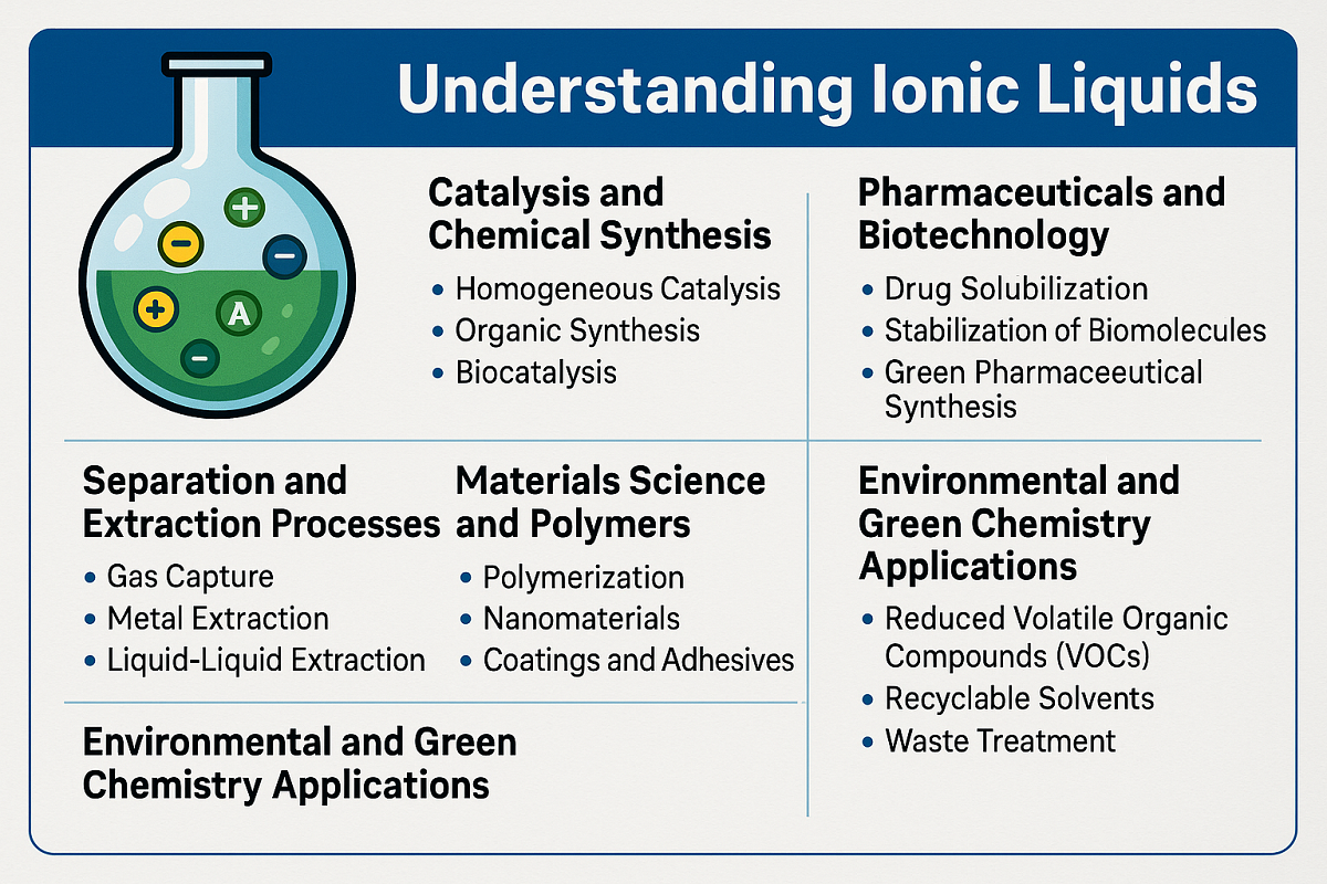 In drug formulation and biotechnology, ionic liquids are used to enhance solubility, stability, and bioavailability: